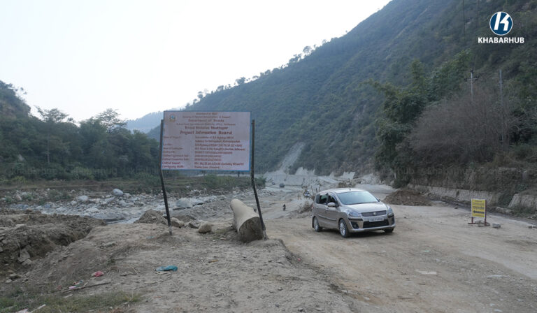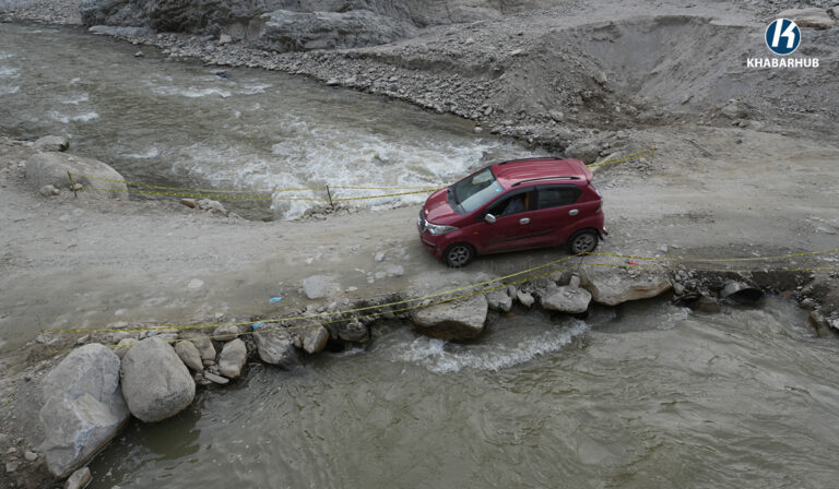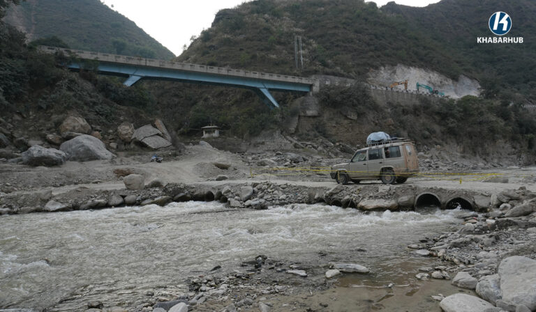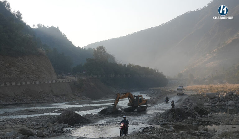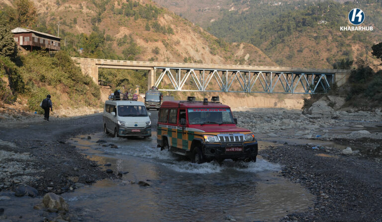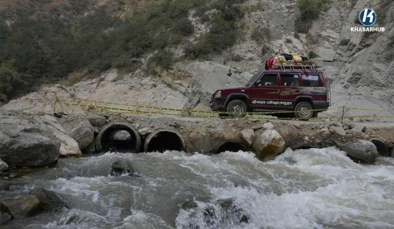बाढीले सडक नै बगाएपछि यो वर्षदेखि खोलामै अस्थायी सडक बनाएर सवारी आवतजावत भइरहेको छ ।