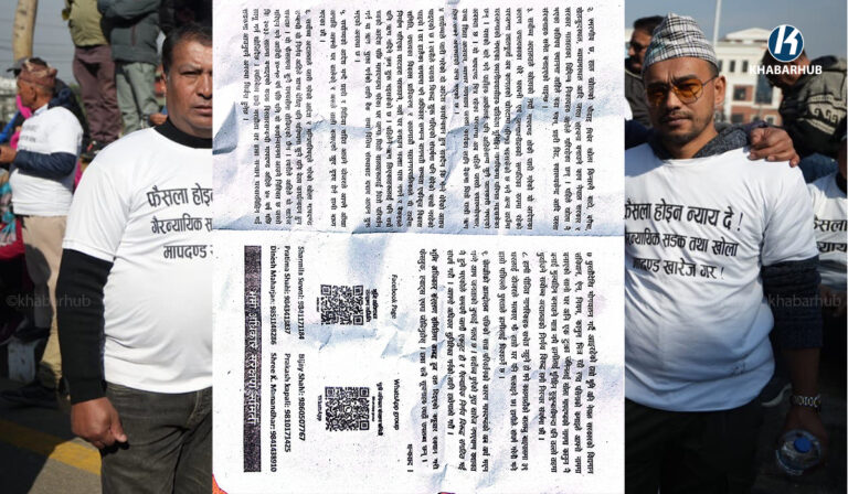 प्रदर्शनीमा ‘फैसला होइन न्याउ देउ, गैर न्यायिक खोला मापदण्ड खारेज गर’, ‘जनतालाई उठिबास गर्ने गैर न्यायिक सडक तथा खोला मापदण्ड खारेज गर’, ‘खोला मिच्न पाइँदैन, मापदण्डको नाममा जनता विस्थापित गर्न पाइँदैन’, ‘खोला नदीको मापदण्ड खारेज गर’ भन्ने नाराका साथ विरोध प्रदर्शन भएको हो ।