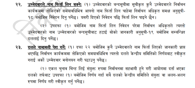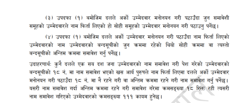 प्रवक्ता भट्टराईले भनेजस्तै समानुपातिकतर्फको बन्दसूचीमा नाम भएको व्यक्तिले कार्यतालिकाअनुसार पुसको २८ गते आफ्नो नाम फिर्ता लिनसक्ने व्यवस्था छ । निर्देशिकाको दफा २२ र २३ मा सो सम्बन्धी स्पष्ट व्यवस्था गरिएको छ ।