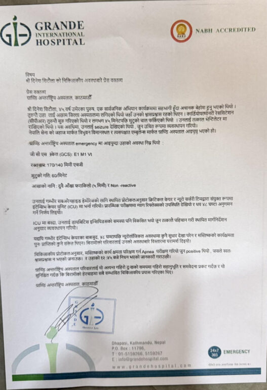 शुक्रबार बिहान बेहोस भएका उनलाई त्यही दिन दिउँसो सेनाको स्काई ट्रकममा काठमाडौं ल्याएर ग्रान्डी अस्पतालको भेन्टिलेटरमा राखिएको थियो ।