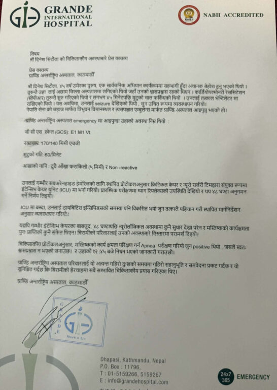 चिकित्सकीय प्रोटोकल अनुसार, मस्तिष्कको कार्य क्षमता परीक्षण गर्न एपनीया परीक्षण गरियो। जुन पोजिटिभ थियो, जसले स्वतः श्वासप्रश्वास नभएको जनाउँछ। र, उनको आइतबार १२:४५ बजे निधन भएको जानकारी गराउँछौँ।