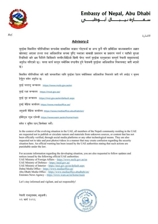 पछिल्लो २४ घण्टामा दोस्रो एडभाइजरी जारी गर्दै दूतावासले यस्तो आग्रह गरेको हो । यूएईमा विकशित परिस्थितिका सन्दर्भमा सामाजिक सञ्जालमा कुनै अज्ञात स्रोतबाट आएका सामग्री पोस्ट नगर्न अनुरोध गरेको हो ।