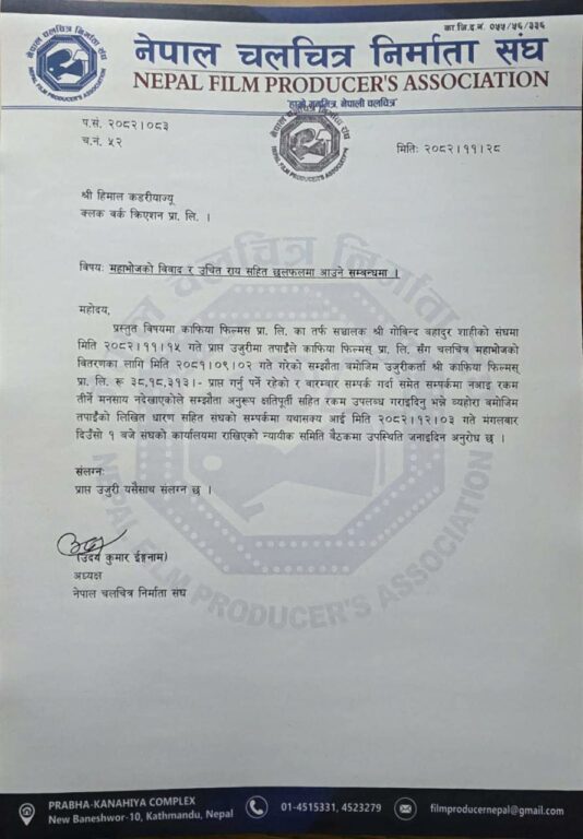 वितरक कम्पनी ‘काफिया फिल्मस्’का सञ्चालक गोबिन्द शाही र निर्माता हिमाल कडरियाबीचको आर्थिक लेनदेनको विवाद नेपाल चलचित्र निर्माता संघको पत्रले बाहिर ल्याएको हो ।