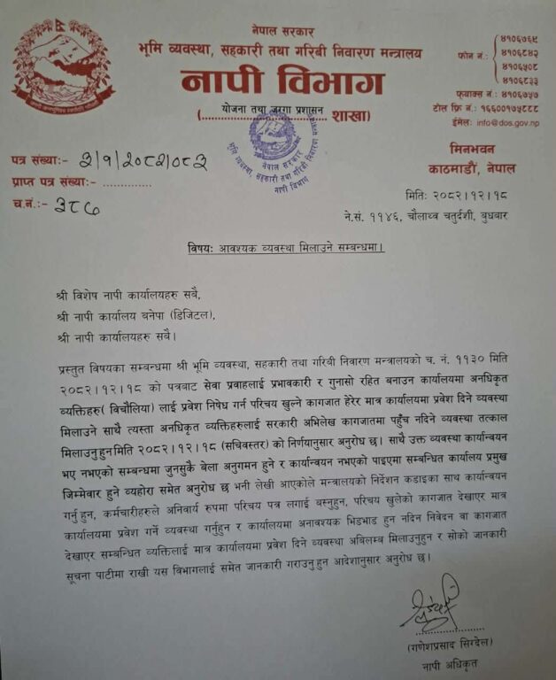 बुधबार भूमि व्यवस्था, सहकारी तथा गरिबी निवारण मन्त्री प्रतिभा रावलको निर्देशन अनुसार सचिव स्तरीय निर्णयबाट देशभरका नापी कार्यालय तथा मालपोत कार्यालयमा परिचय खुल्ने कागजात हेरेर मात्रै प्रवेश गराउन सम्बन्धित विभागले पत्राचार गरेका हुन् ।
