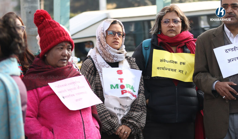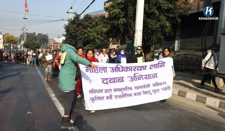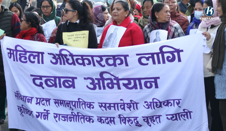 काठमाडौं– महिला अधिकारका लागि दबाब अभियानले संविधान प्रदत्त समानुपातिक समावेशी अधिकार कुण्ठित गर्न राजनीतिक कदम चालिएको भन्दै माइतीघरमा विरोध प्रदर्शन गरेका छन् ।