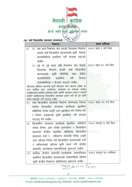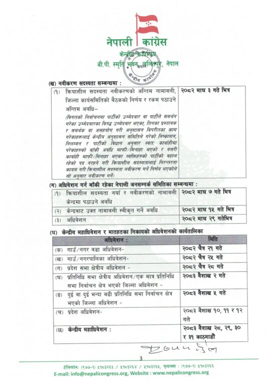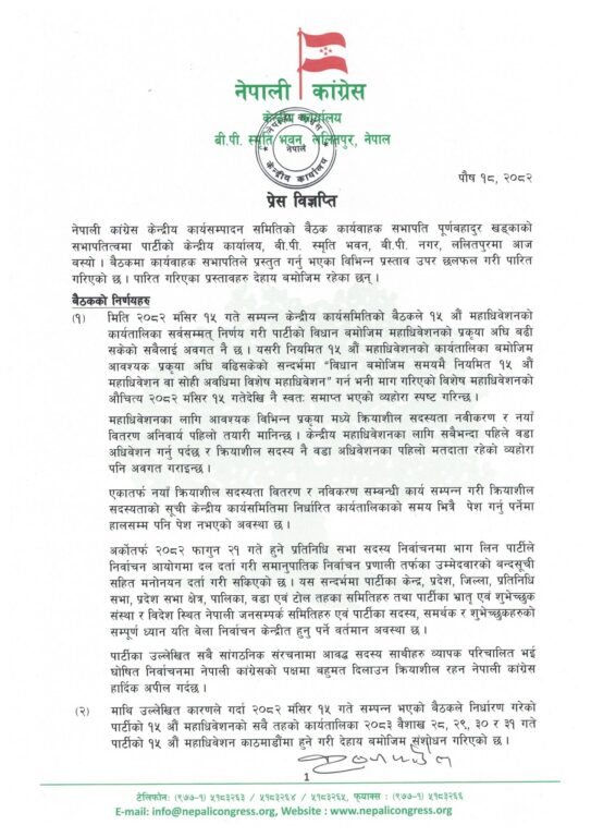 कार्यवाहक सभापति पूर्णबहादुर खड्काको सभापतित्वमा बसेको बैठक निर्णय सार्वजनिक गर्न जारी गरिएको विज्ञप्तिमा भनिएको छ, ‘१५औँ महाधिवेशनको कार्यतालिका बमोजिम आवश्यक प्रकृया अघि बढिसकेको सन्दर्भमा ‘विधान बमोजिम समयमै नियमित १५औँ महाधिवेशन वा सोही अवधिमा विशेष महाधिवेशन’ गर्न भनी माग गरिएको विशेष महाधिवेशनको औचित्य २०८२ मंसिर १५ गतेदेखि नै स्वतः समाप्त भएको व्यहोरा स्पष्ट गरिन्छ ।’
