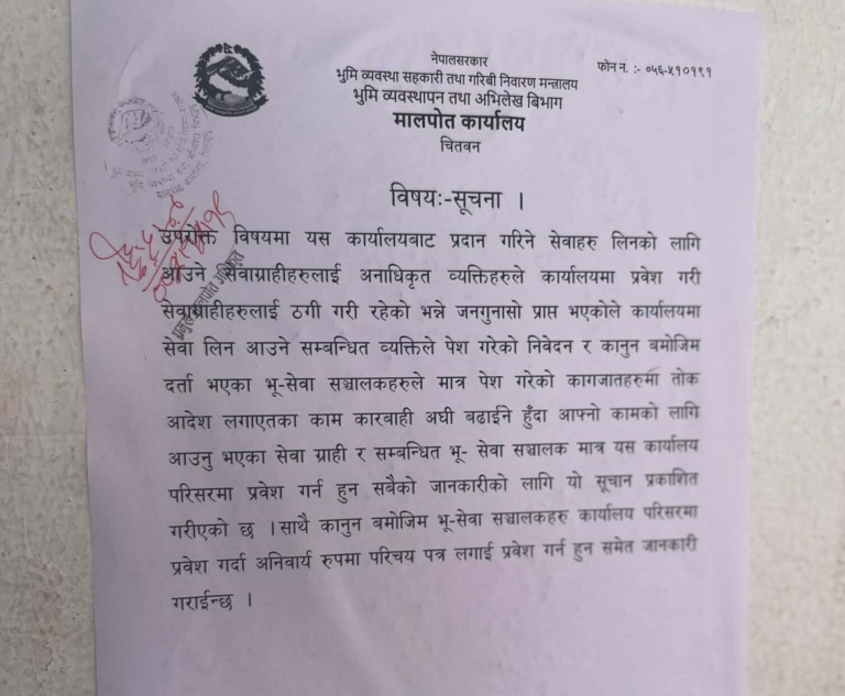 मालपोत कार्यालयले एक सूचना जारी गर्दै अब अनधिकृत व्यक्तिहरूको प्रवेशमा पूर्ण रोक लगाएको जनाएको छ।