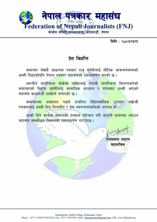 महासंघले जारी गरेको प्रेस विज्ञप्तिमा भारतीय नागरिकता बोकेको व्यक्तिलाई नेपाली नागरिकता वितरणसम्बन्धी समाचार प्रकाशित भएपछि सुवेदीलाई सामाजिक सञ्जाल र फोनमार्फत धम्की आएको उल्लेख गरिएको छ।