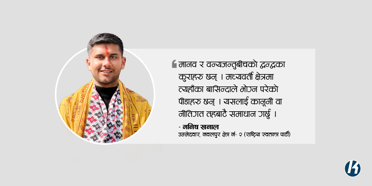 केन्द्रको घोषणापत्रमा पक्कै यसको बारेमा आउँछ । भूमिहीनका समस्या छन् । त्यसैगरी तल्लो भेगमा जो नारायणी कटानका विषय छन् । मानव र वन्यन्तुबीचको द्वन्द्वका कुराहरू छन् । मध्यवर्ती क्षेत्रमा त्यहाँका बासिन्दाले भोग्न परेको पीडाहरू छन् । यसलाई कानूनी वा नीतिगत तहबाटै समाधान गर्छु ।