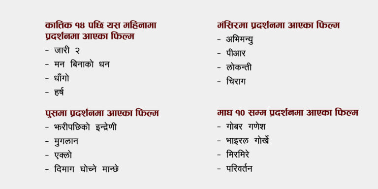 मंसिरमा ५ र पुसमा ४ फिल्म प्रदर्शनमा आए । माघ १६ सम्म ५ फिल्म प्रदर्शनमा आइसके । माघ १ गतेमात्रै तीन फिल्म ‘मिरमिरे’, ‘भाइरल गोर्खे’ र ‘गोबर गणेश’ प्रदर्शनमा आए ।