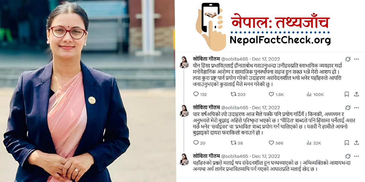 तर, केही दिनअघि मात्रै पत्रकार ईश्वर अर्यालको फेसबुक स्टाटस र राजु पहारीले उक्त अन्तर्वार्ताको मुख्य विवादित भिडियो क्लिप सेयर गरेका आधारमा ‘नेपालफ्याक्टचेकडटओआरजी’ले मूल ‘सन्दर्भ काटेर फैल्याइएको सोविता गौतमको ‘बलात्कार र थप्पड’ सम्बन्धी भनाइ भ्रामक’ शीर्षकमा समाचार नै तयार पार्यो ।
