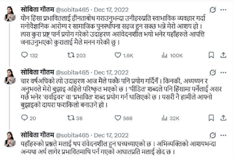 तर नेतृ गौतमले सांसदमा निर्वाचित भएपछि २०७९ मै उनले आफ्नो उक्त पुरानो भनाइप्रति खेद प्रकट गरेसँगै उक्त विषय सेलाएको थियो ।