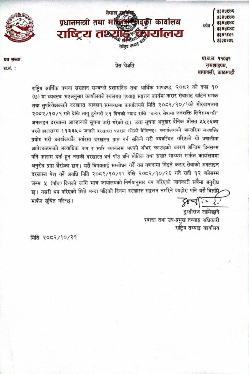 काठमाडौँ– राष्ट्रिय तथ्यांक कार्यालयले, राष्ट्रिय आर्थिक गणनाका लागि करारमा कर्मचारी