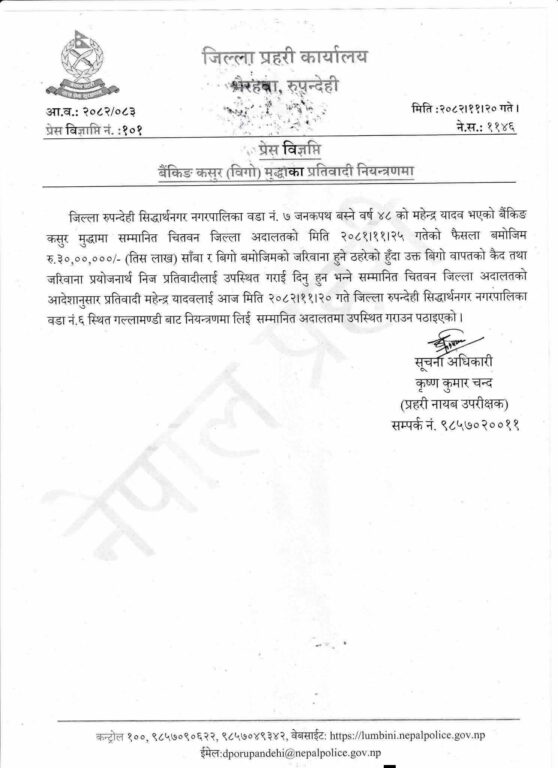 उनलाई बैङ्किङ कसुर मुद्धामा पक्राउ गरिएको जिल्ला प्रहरी कार्यालय रूपन्देहीले जनाएको छ ।