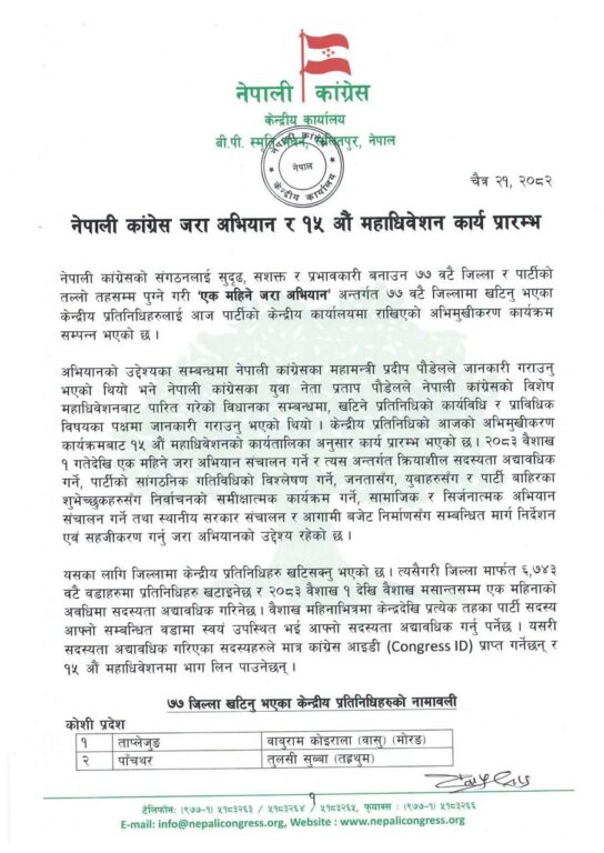 ‘कांग्रेसको सङ्गठन सुदृढीकरण र सामाजिक अभियानमा जोडिनका लागि ‘जरा अभियान’ सञ्चालन गरिँदै छ । पुराना क्रियाशील सदस्यहरूले वैशाख महिनाभित्र वडावडामा गएर अनिवार्य रूपमा सदस्यता अद्यावधिक गर्नुपर्नेछ । पार्टीले यसपटक सबै सदस्यलाई कांग्रेस ‘आइडी’ प्रदान गर्नेछ र यो परिचयपत्र नभएका व्यक्तिहरूले १५औँ महाधिवेशनमा भाग लिन पाउने छैनन्’, उनले भने।