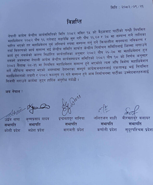 ‘लुम्बिनीका सभापतिलाई आग्रह गरेका छौँ । गण्डकीका सभापतिले समय माग्नु भएको छ’, उनले भने, ‘वर्तमान परिस्थितिमा पार्टीको आधिकारिक धारणाको पक्षमा उभिनु पर्छ भन्ने हाम्रो मान्यता हो। विशेष अधिवेशनको औचित्य सकिएको कुरा कार्यसम्पादन समितिले भनिसकेको छ।’