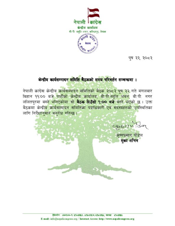 काठमाडौं – नेपाली कांग्रेसको केन्द्रीय कार्यसम्पादन समिति बैठक सरेको छ । पार्टी कार्यालयका मुख्यसचिव कृष्णप्रसाद पौडेलका अनुसार बिहान ११ बजे बस्ने भनिएको बैठक सरेको हो । बैठक दिउँसो १ बजे पार्टी केन्द्रीय कार्यालय सानेपामा बस्नेछ।