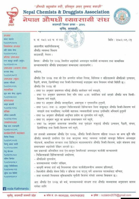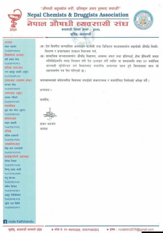 संघले औषधि व्यवस्था विभागका महानिर्देशक डा. नारायण ढकाललाई ध्यानाकर्षण पत्र बुझाउँदै अनलाइन तथा डिजिटल माध्यममार्फत भइरहेको औषधिको बिक्री, वितरण र प्रचार–प्रसार तत्काल नियन्त्रणमा लिन आग्रह गरेको हो ।