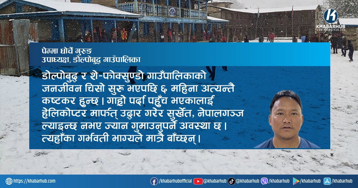 ‘मंसिरदेखि वैशाखसम्म ६ महिना यहाँको जनजीवन एकदमै कष्टकर हुन्छ’, चिसोबाट जोगिन काठमाडौं आएका डोल्पोबुद्ध गाउँपालिकाका उपाध्यक्ष पेम्मा धोर्चे गुरुङले भने।