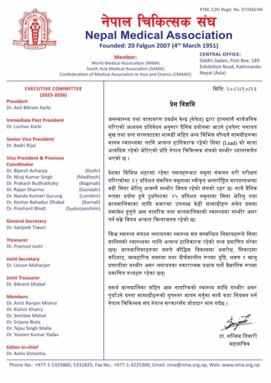 जनस्वास्थ्य तथा वातावरण प्रवर्द्धन केन्द्र (सीपीओई) ले हालै सार्वजनिक गरेको अध्ययन प्रतिवेदन अनुसार बजारमा उपलब्ध सामग्रीहरूको परीक्षण गर्दा ठूलो संख्यामा नमुनामा अन्तर्राष्ट्रिय मापदण्डभन्दा बढी सिसा भेटिएको खुलासा भएको घटनाप्रति संघको गम्भिर ध्यानाकर्षण भएको महाँसचिव डा. सञ्जिव तिवारीद्वारा जारी बिप्तिमा उल्लेख छ ।
