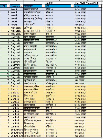 नेपाली कांग्रेसले पाँच क्षेत्रमा अग्रता लिँदा एमाले चार र नेकपा २ क्षेत्रमा अगाडि छ भने राप्रपाले एक क्षेत्रमा अग्रता लिएको छ।
