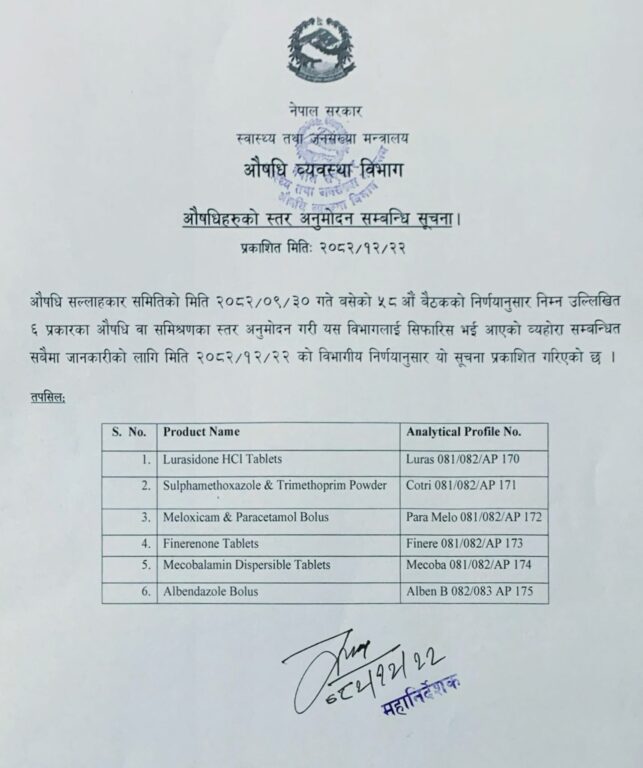 विभागले सूचना जारी गर्दै औषधि सल्लाहकार समितिको ५८औँ बैठकको सिफारिस र विभागीय निर्णयअनुसार ती औषधिहरूको ‘एनालाटिकल प्रोफाइल’ स्वीकृत गरिएको जनाएको हो ।