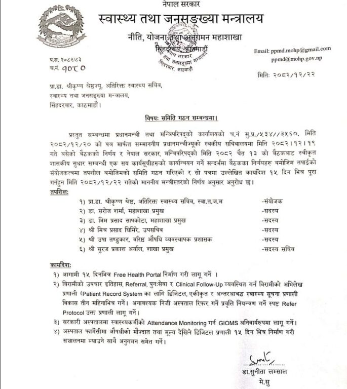 काठमाडौं– स्वास्थ्य तथा जनसंख्या मन्त्रालयले स्वास्थ्य सेवालाई पारदर्शी, प्रविधिमैत्री र नागरिकमुखी बनाउनका लागि मन्त्रालयका अतिरिक्त सचिव प्रा.डा. श्रीकृष्ण श्रेष्ठको संयोजकत्वमा समिति गठन गरेको छ ।