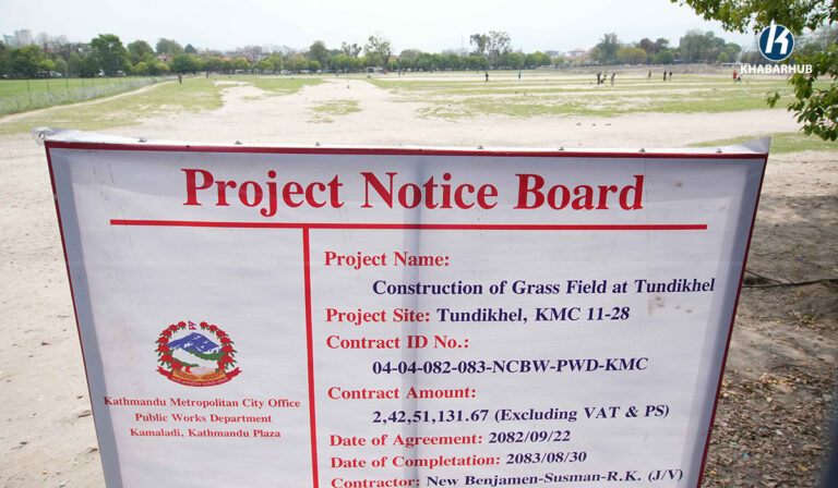 काठमाडौं– काठमाडौँ महानगरपालिकाले टुँडिखेलको दक्षिण भाग (सैनिक मञ्चको दक्षिणतर्फको चउर) मा घाँसे मैदान निर्माण कार्य अगाडी बढाएको छ ।