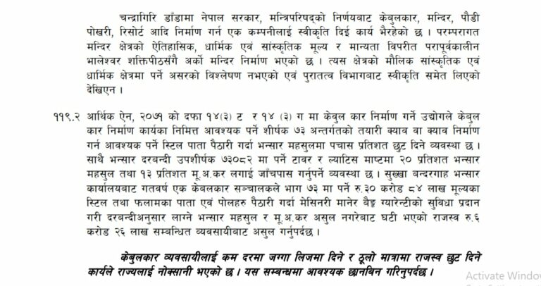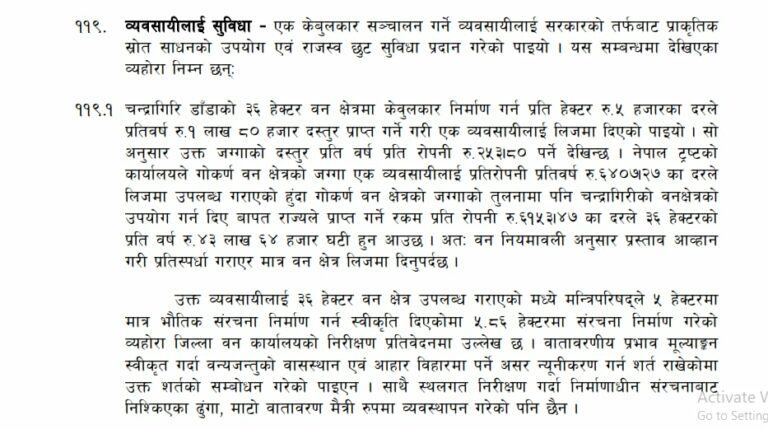 ‘नेपाल ट्रस्टको कार्यालयले गोकर्ण वन क्षेत्रको जग्गा एक व्यवसायीलाई प्रतिरोपनी प्रतिवर्ष रु. ६४०७.२७ का दरले लिजमा उपलब्ध गराएको हुँदा गोकर्ण वन क्षेत्रको जग्गाको तुलनामा पनि चन्द्रागिरिको वनक्षेत्रको उपयोग गर्न दिए बापत राज्यले प्राप्त गर्ने रकम प्रति रु. ६१५३.४७ का दरले ३६ हेक्टरको प्रतिवर्ष रु. ४३ लाख ६४ हजार घटी हुन आउँछ । अतः वन नियमावली अनुसार प्रस्ताव आह्वान गरी प्रतिस्पर्धा गराएर मात्र वन क्षेत्र लिजमा दिनुपर्दछ’, प्रतिवेदनमा भनिएको छ ।
