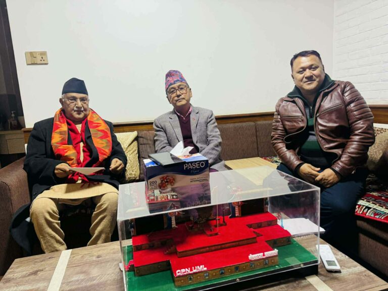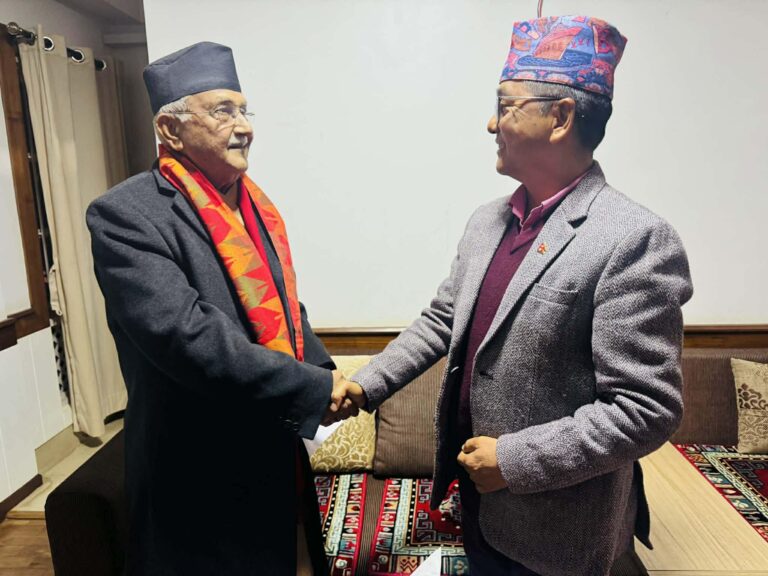 काठमाडौं – नेकपा एमालेका अध्यक्ष केपी शर्मा ओली र राष्ट्रिय प्रजातन्त्र पार्टी (राप्रपा)का अध्यक्ष राजेन्द्र लिङ्देनबीच बुधबार साँझ भेटवार्ता भएको छ। भेट भक्तपुरस्थित ओली निवास गुण्डुमा सम्पन्न भएको हो।