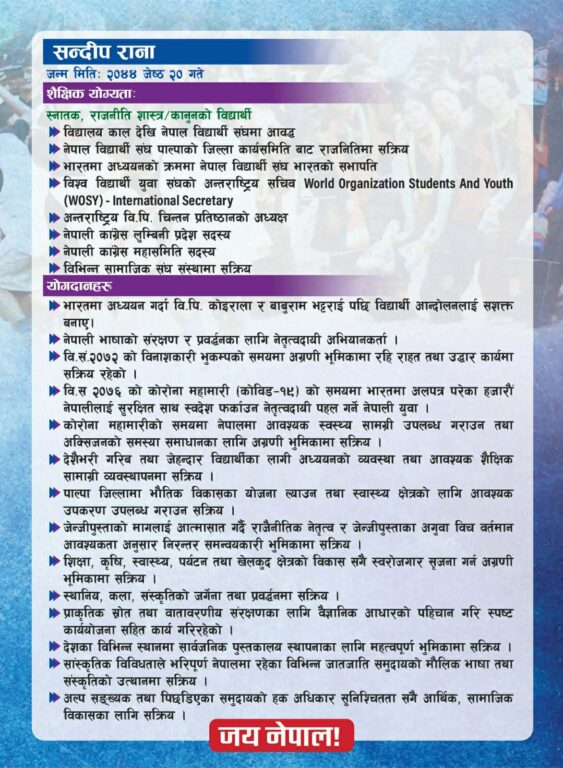 यो क्षेत्रबाट २०४८ सालको बहुदलीय निर्वाचनपछि पहिलो पटक कांग्रेसको जित आएको हो । त्यतिबेला कालुराम रानाले एमालेका दलबहादुर रानालाई पराजित गरेर कांग्रेसको विजय सुनिश्चित गरेका थिएm। ३४ वर्षपछि सन्दीप रानाले पुनः कांग्रेसको झण्डा पाल्पा–१ मा फहराएका छन् ।