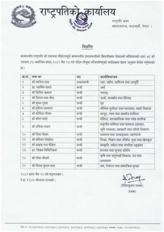 १. वालेन्द्र शाह-प्रधानमन्त्री (रक्षा; उद्योग, वाणिज्य तथा आपूर्ति)