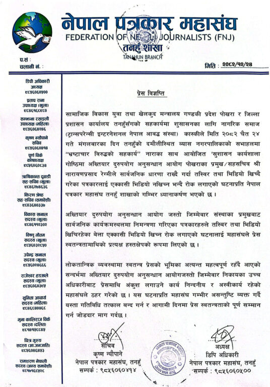 दमौली- नेपाल पत्रकार महासंघ तनहुँ शाखाले पत्रकाहरूलाई फोटो-भिडियो खिच्न रोक लगाएको घटनाप्रति गम्भीर आपत्ति जनाएको छ।