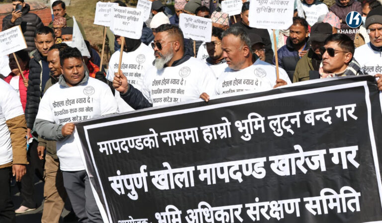 खोला मापदण्डविरुद्ध भूमि अधिकार संरक्षण समितिले बिहीबार काठमाडौँको माइतीघरमा विरोध प्रदर्शन गरेका हुन् । । सडक तथा खोला मापदण्डका नाममा ८४ हजार भन्दा बढी घरधुरीको उठीबास लाग्ने अवस्था आएकोले विरोध प्रदर्शन गर्नुपरेको समितिले जनाएको छ । २०८० साल पुस ३ गते सर्वोच्च अदालतले २० मिटर मापदण्ड तोकेर ४० मिटर दाँयाबाँया कायम गर्न आदेश दिएको थियो ।