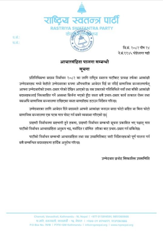 काठमाडौं– राष्ट्रिय स्वतन्त्र पार्टी (रास्वपा)ले प्रतिनिधिसभा सदस्य निर्वाचन २०८२ का लागि प्रत्यक्षतर्फ उम्मेदवार बन्न चाहनेलाई आचारसंहिता पालना गर्न निर्देशन दिएको छ।