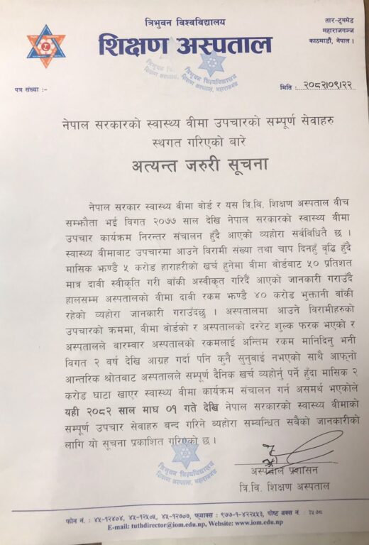 अस्पताल प्रशासनले जारी गरेको सूचनाअनुसार स्वास्थ्य बीमा बोर्डले नियमित रूपमा ठूलो परिमाणमा दाबी रकम अस्वीकृत गर्न थालेपछि सेवा सञ्चालन असम्भव बनेको हो।