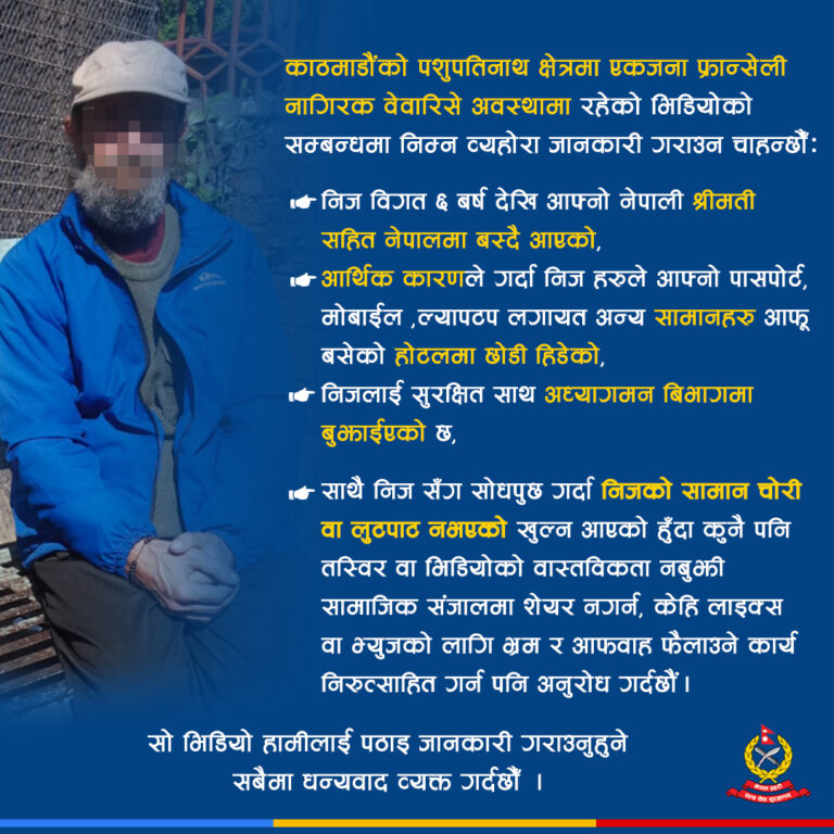 काठमाडौँ– काठमाडौँको पशुपतिनाथ क्षेत्रमा एक फ्रान्सेली नागरिक बेवारिसे अवस्थामा भेटिएको भिडियोका सम्बन्धमा सत्यतथ्य सार्वजनिक गरिएको छ। सामाजिक सञ्जालमा उक्त भिडियो भाइरल भएपछि सम्बन्धित निकायले अनुसन्धान गरी ती नागरिकको वास्तविक अवस्थाबारे नेपाल प्रहरी जानकारी गराएको हो।