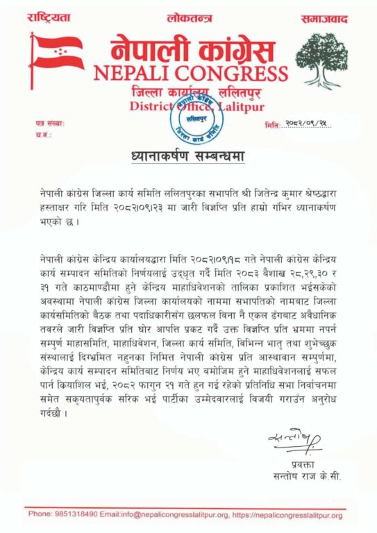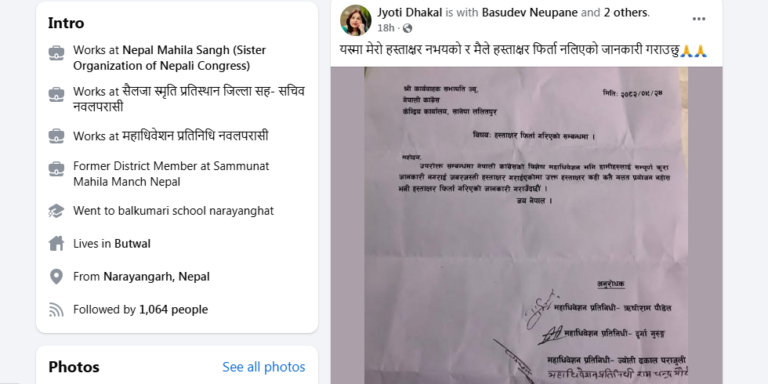 त्यस्तै, चितवनकी ज्योती ढकालले पनि आफूले विशेष महाधिवेशनको पक्षमा हस्ताक्षर फिर्ता नलिएको भन्दै सामाजिक सञ्जालमा प्रचार गरिएको पत्र सार्वजनिक गरेकी छन् ।