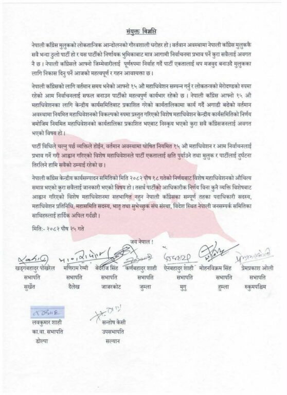 काठमाडौं- पश्चिम नेपालका विभिन्न नौ जिल्लाका कांग्रेस सभापतिहरुले विशेष महाधिवेशनको औचित्य नरहेको बताएका छन् । उनीहरुले विशेष महाधिवेशनमा सहभागी नहुन पनि आह्वान गरेका छन् ।