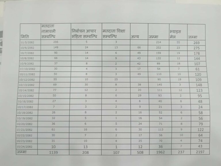 ‘२५ दिनमा २ हजार १ सय ९७ वटा कल आएको रेकर्ड मध्ये सबैभन्दा बढी मतदाता नामावलीसम्बन्धी १ हजार १ सय ३९ गुनासा आए,’ उनले भने ।