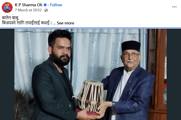 झापा ५ बाट पराजित एमाले अध्यक्ष तथा पूर्वप्रधानमन्त्री केपी ओलीले आफ्ना प्रतिस्पधी बालेन्द्र शाहलाई ५ वर्षे कार्यकाल सफल होस् भनी शुभकामना दिएका छन् । कांग्रेस, एमाले, नेपाली कम्युनिष्ट पार्टीका अधिकांश पराजित उम्मेदवारले शुभकामना व्यक्त गरेका छन् भने जितेका उम्मेदवारहरु पनि पराजितसँग आशिर्वाद लिन पुगेको दृश्य सामाजिक सञ्जालमा यत्रतत्र देख्न पाइन्छ ।
