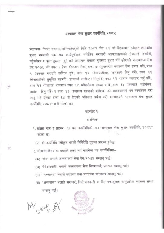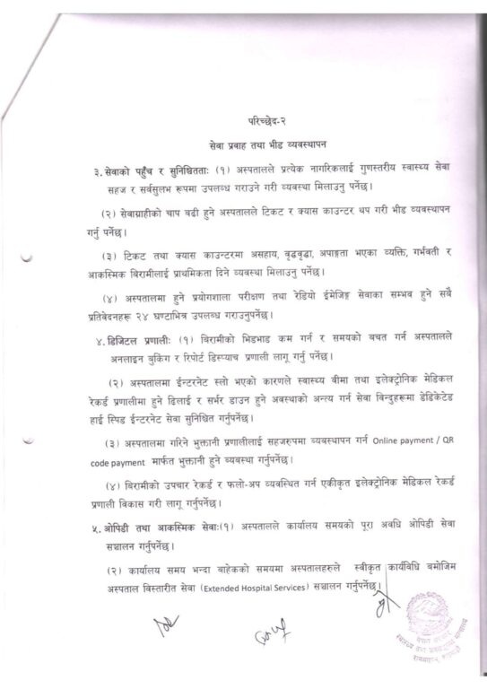 काठमाडौं- स्वास्थ्य तथा जनसङ्ख्या मन्त्रालय ले सरकारी अस्पतालहरूको सेवा जनमैत्री, पहुँचयोग्य र प्रभावकारी बनाउन “अस्पताल सेवा सुधार कार्यविधि, २०८२” जारी गरेको छ । कार्यविधि स्वीकृत भएसँगै देशभरका सरकारी अस्पतालमा तुरुन्त लागू हुने मन्त्रालयले जनाएको छ । कार्यविधि अनुसार अस्पतालमा हुने भीडभाड कम गर्न अनलाइन बुकिङ र रिपोर्ट वितरण प्रणाली अनिवार्य गरिएको छ ।