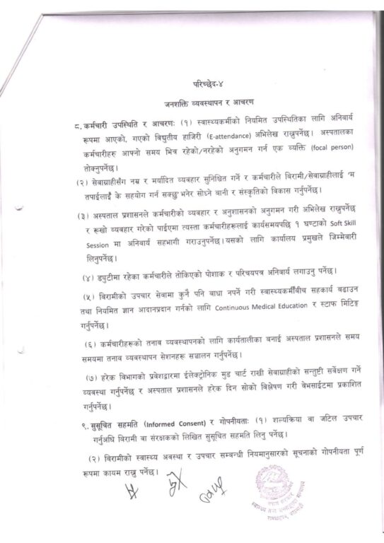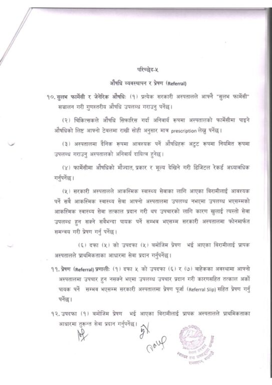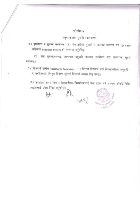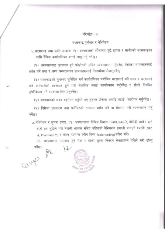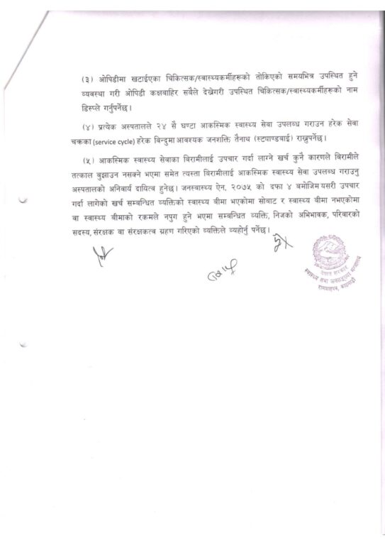 आकस्मिक बिरामीलाई आर्थिक अभावका कारण उपचारबाट वञ्चित गर्न नपाइने स्पष्ट गरिएको छ । साथै, उपचार सम्भव नभएमा अर्को सरकारी अस्पतालसँग समन्वय गरेर मात्रै बिरामी रिफर गर्नुपर्नेछ । सरसफाइ व्यवस्थापनलाई पनि कडाइ गरिएको छ । शौचालय तथा अस्पताल परिसरको नियमित सरसफाइका लागि दैनिक कार्यतालिका र चेकलिस्ट अनिवार्य गरिएको छ ।