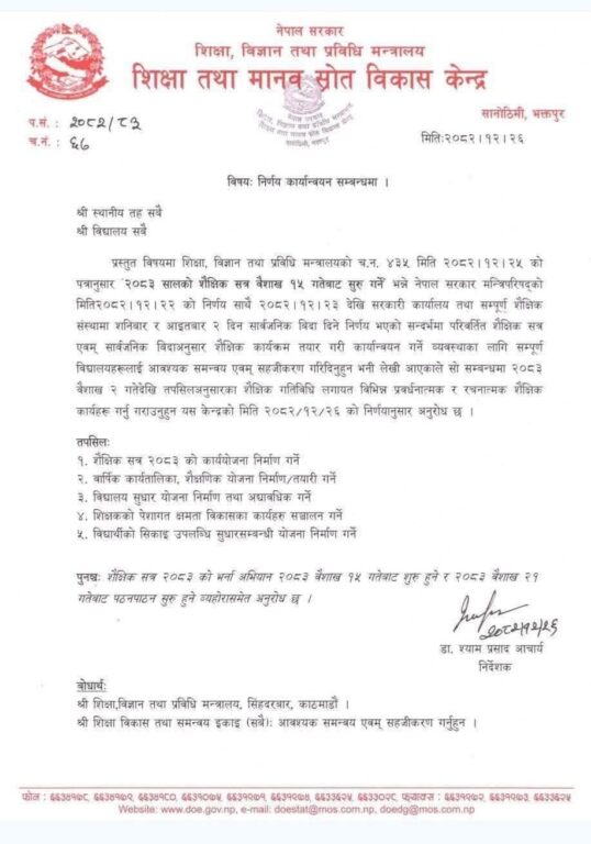 काठमाडौँ – नेपाल सरकारले नयाँ शैक्षिक सत्र २०८३ वैशाख १५ गते र पढाइ २१ गतेदेखि सुरु गर्ने निर्णय गरेको छ । शिक्षा, विज्ञान तथा प्रविधि मन्त्रालयको निर्देशनअनुसार शिक्षा तथा मानव स्रोत विकास केन्द्र, सानोठिमी भक्तपुरले बिहीबार एक पत्र जारी गर्दै उक्त निर्णय कार्यान्वयन गर्न सबै स्थानीय तह र विद्यालयलाई निर्देशन दिएको हो ।