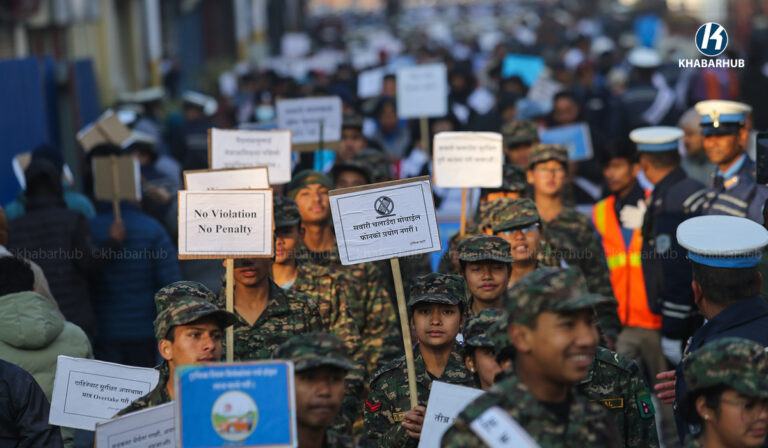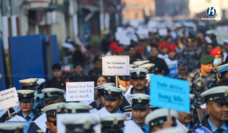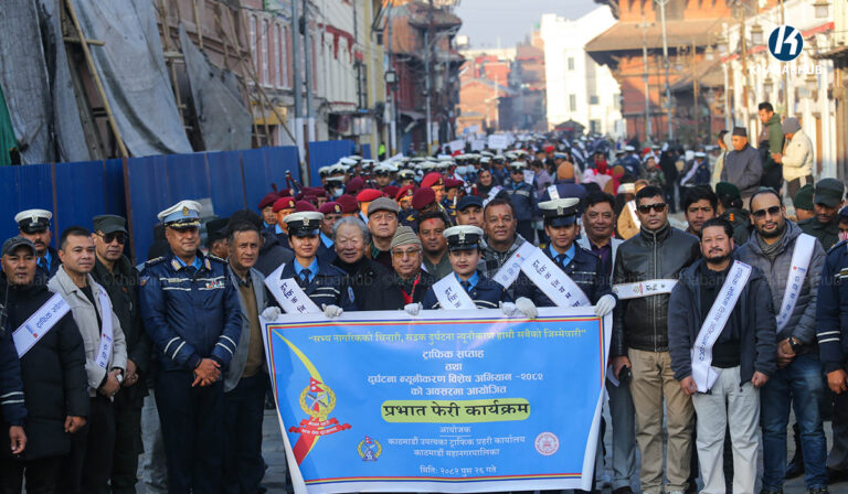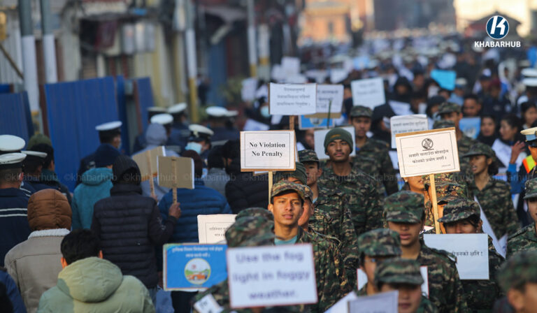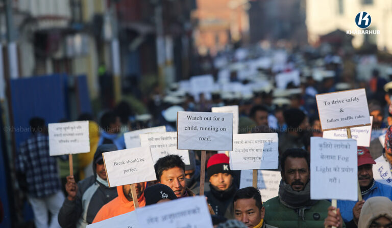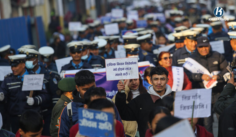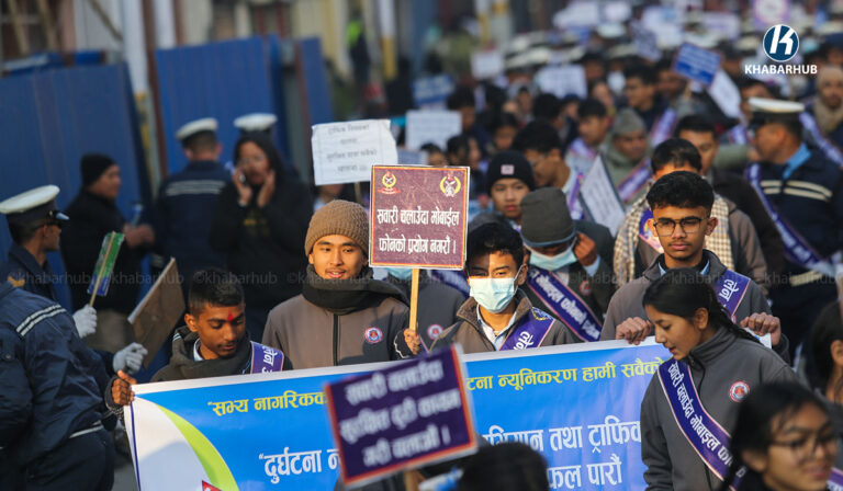 सहभागीहरूले हातहातमा ट्राफिक सचेतनासम्बन्धी ‘प्लाकार्ड’ र ब्यानरहरू बोकेका थिए ।