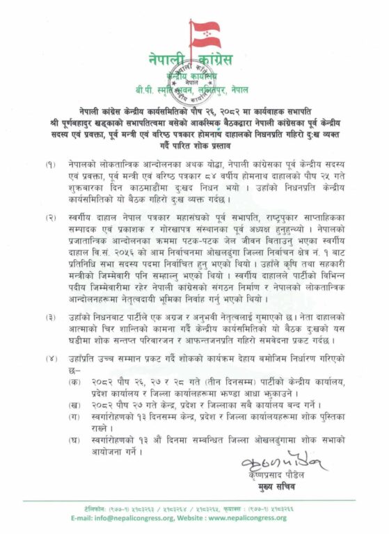 काठमाडौं– नेपाली कांग्रेसका पूर्व केन्द्रीय सदस्य एव वरिष्ठ पत्रकार होमनाथ दाहालको निधनप्रति कांग्रेस केन्द्रीय कार्यसमिति बैठकले दुःख व्यक्त गर्दै शोक प्रस्ताव पारित गरेको छ ।