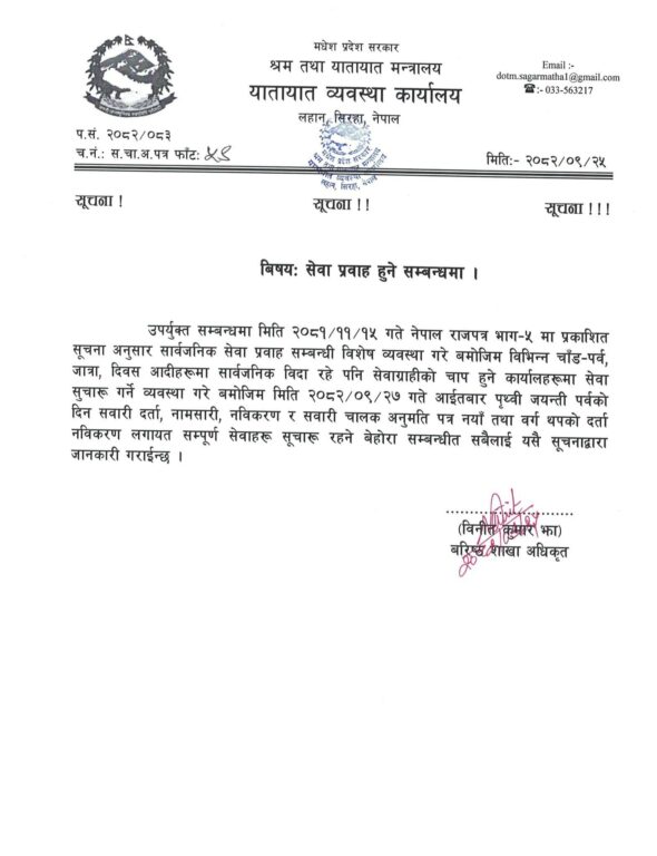 मधेश प्रदेश सरकारअन्तर्गत श्रम तथा यातायात मन्त्रालयको मातहतमा रहेको कार्यालयले सूचना जारी गर्दै सार्वजनिक बिदाका दिन पनि सेवाग्राहीको चापलाई ध्यानमा राखी सेवा प्रवाह गर्ने व्यवस्था गरिएको जनाएको हो।