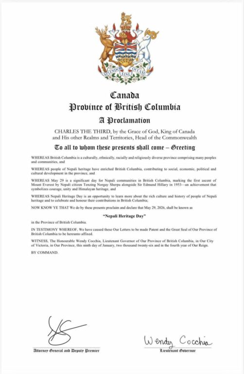 काठमाडौं- क्यानडाको ब्रिटिश कोलम्बिया प्रान्तले सन् २०२६ मे २९ लाई आधिकारिक रूपमा “नेपली हेरिटेज डे” घोषणा गरेको छ ।
