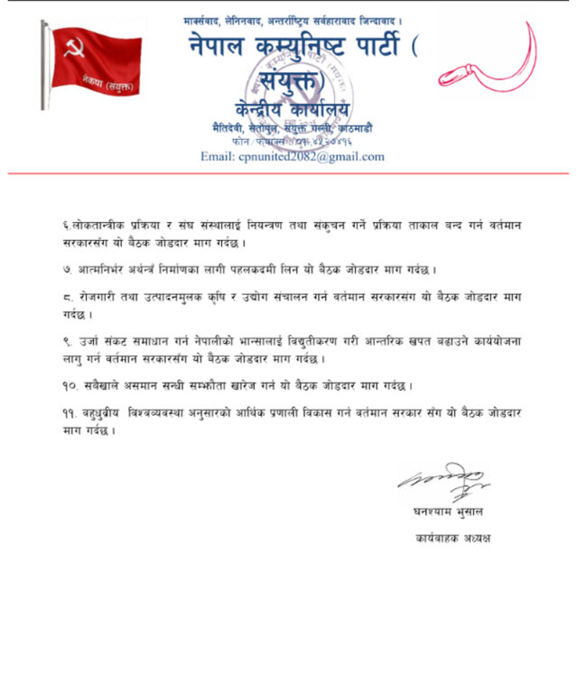 पार्टीले आत्मनिर्भर अर्थतन्त्रको निर्माण, रोजगारी प्रवद्र्धन र ऊर्जा संकट समाधानका लागि नेपाली भान्सालाई विद्युतीकरण गर्ने कार्ययोजना ल्याउन सरकारलाई दबाब दिएको छ । असमान सन्धि सम्झौताहरू खारेज गर्नुपर्ने र बहुध्रुवीय विश्व व्यवस्था अनुसारको आर्थिक प्रणाली विकास गर्नुपर्नेमा पार्टीले जोड दिएको छ । नेकपा संयुक्तले आगामी असोजभित्र जिल्ला तहमा संगठन विस्तार गरी मंसिरमा राष्ट्रिय सम्मेलन गर्ने निर्णय समेत गरेको छ ।