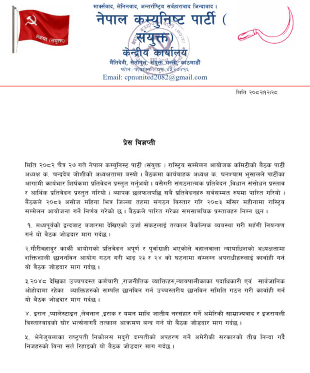 पार्टीको हालै सम्पन्न राष्ट्रिय सम्मेलन आयोजक कमिटीको बैठकले विभिन्न ११ बुँदे समसामयिक प्रस्तावहरू पारित गरेको विज्ञप्तिमा उल्लेख छ । बैठकले वि.सं. २०४८ देखिका उच्चपदस्थ कर्मचारी र राजनीतिक व्यक्तिहरूको सम्पत्ति छानबिन गर्न उच्चस्तरीय समिति गठनको माग गरेको छ । यस्तै, मध्यपूर्वको द्वन्द्वका कारण सिर्जित ऊर्जा संकट समाधान गर्न र बजारमा व्याप्त महँगी नियन्त्रण गर्न सरकारलाई आग्रह गरिएको छ ।